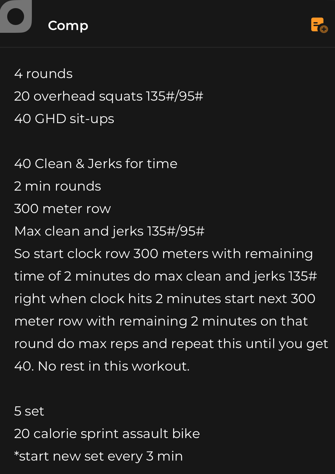 Goal: 40-60 Hang Power Snatches 30-45 Squat + Press 25-40 Burpees
